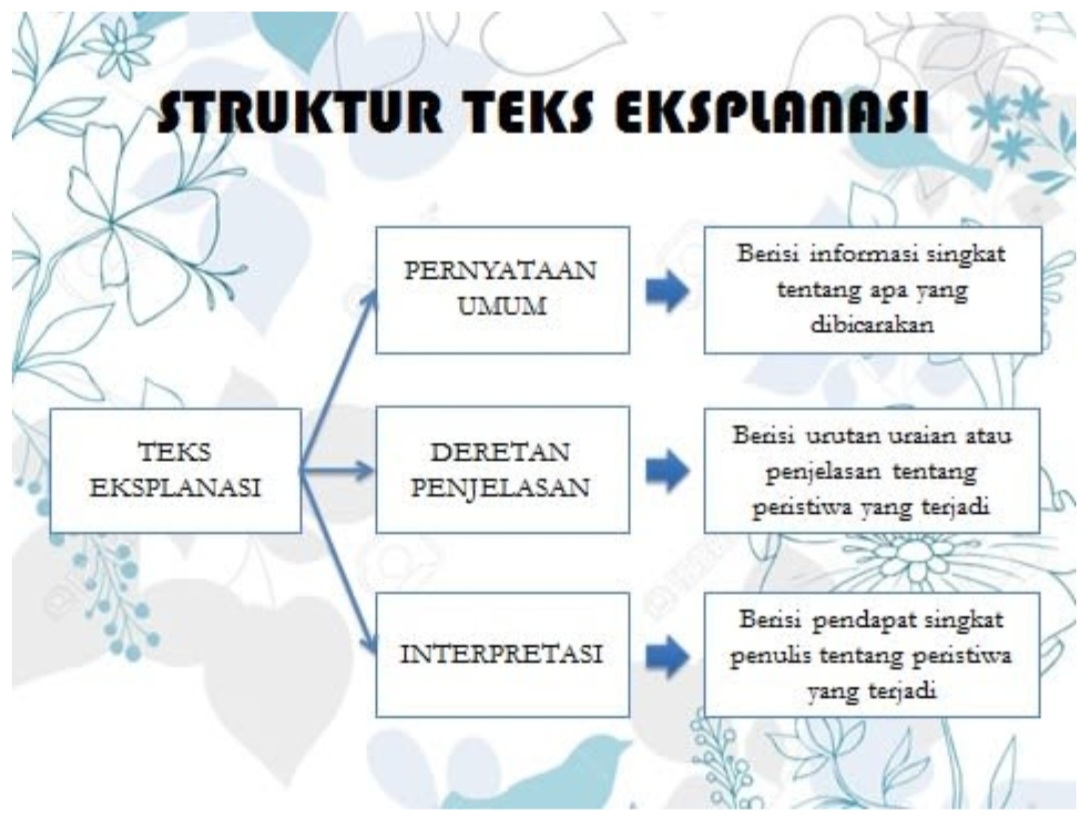 Struktur umum teks eksplanasi terdiri dari tiga bagian utama: pernyataan umum (identifikasi fenomena), deretan penjelas (uraian sebab-akibat), dan interpretasi (kesimpulan atau pandangan penulis).